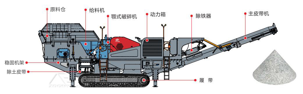 4、整机包含给料、筛分、输送、破碎四大功能,可代替传统生产线使用,搭配非常灵活。